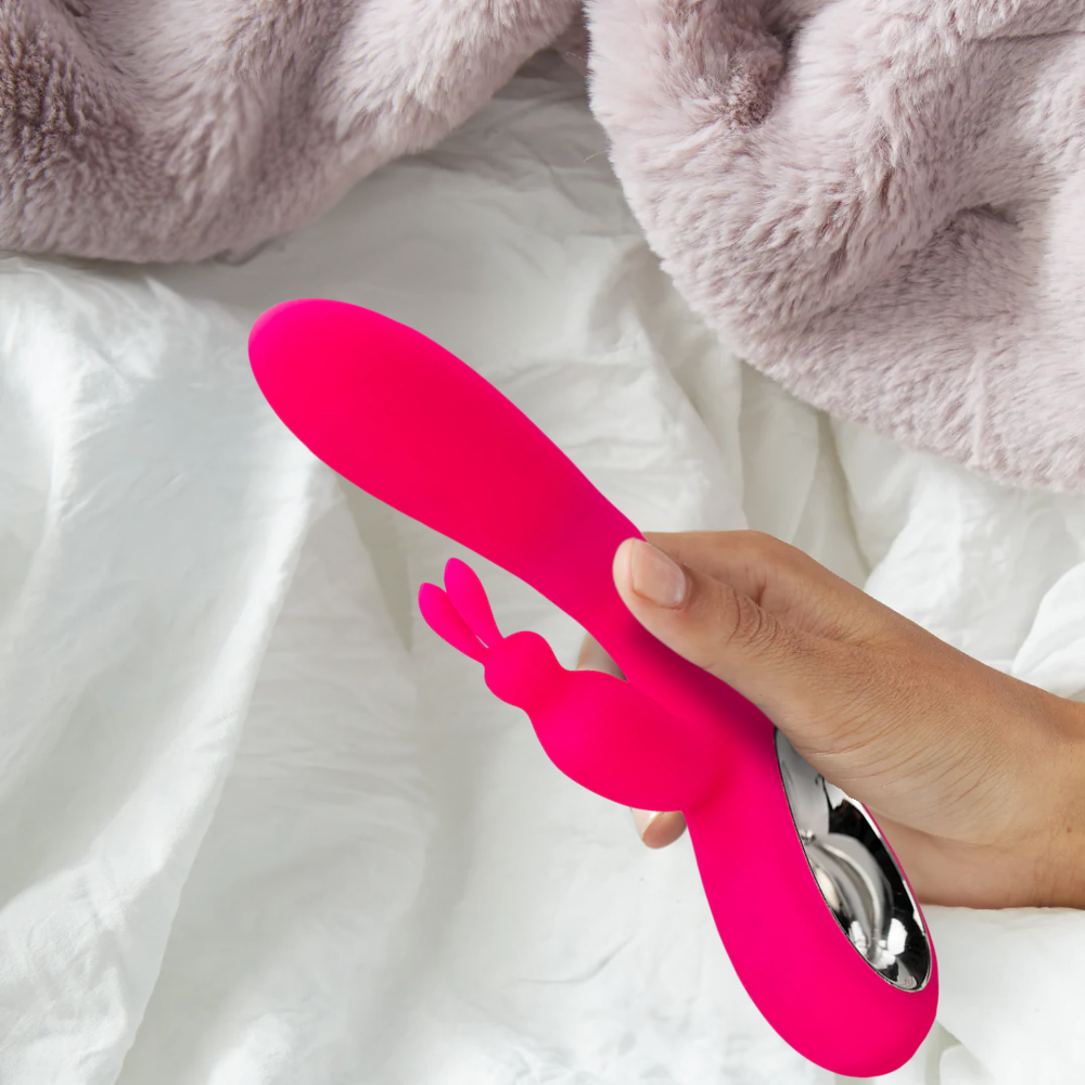 Ready to bunny-hop to bliss? Well, meet Hoppy Go Lucky. This dual-action vibrator features a looped handle, a rabbit-eared clitoral stimulator, and a flexible silicone shaft. This pink powerhouse will have you jumping for joy with its 72(!) combined vibrating features, 36 in the flexible shaft and another 36 in the clitoral teaser. Each motor is independently controlled so you can mix and match speeds and patterns and find your perfect combo.